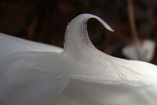 These delicate ice flowers or frost flowers only occur when freezing weather happens before the ground is is frozen for the winter. Long thin cracks form along the stem of plants as the sap freezes and expands. The moisture is drawn through the cracks on the plant stems by capillary action and freezes when the sap oozes out into the air. As more sap is drawn from the stem, these thin layers of ice keep pushing out, forming thin “petals”. The thin frost flowers will shatter if touched and disappear as the sun rises.